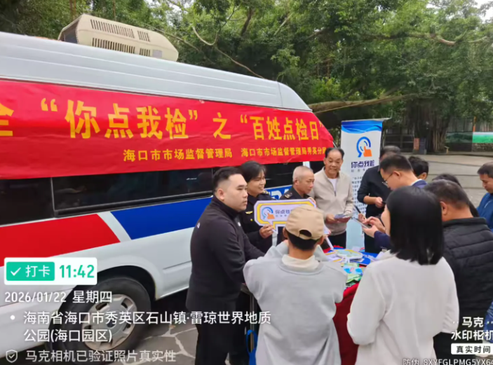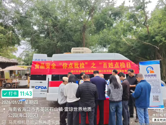 春节前夜,为进一步提拔食物抽检工做参取度,加强人平易近群众对年货食物平安的获得感和对劲度,营制食物平安社会共治共享款式,海口市市场监视办理局正在区火山口地质公园开展年货购食物平安“你点我检”之“苍生点检日”宣传勾当。